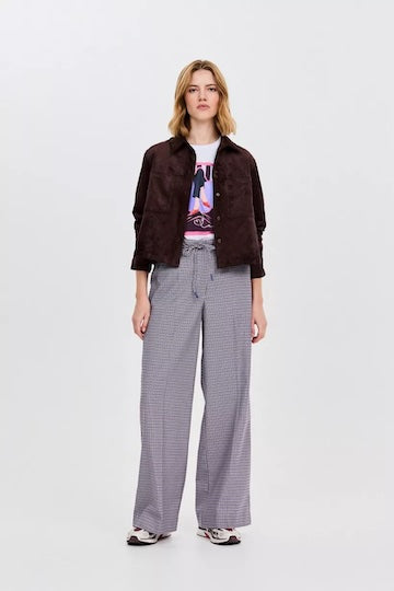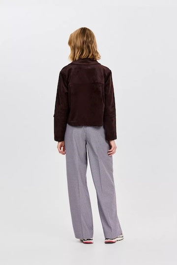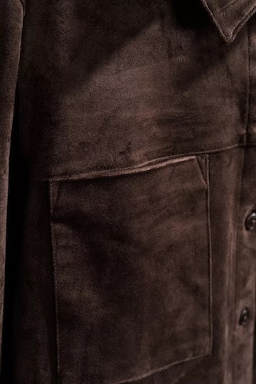 Met deze bruine, korte suede jas in suedine combineer je twee trends in één stuk. Chocoladebruin is niet enkel de ultieme kleur van deze herfst en winter, suedine is ook de meest populaire stof. Deze korte jas heeft een hemdkraag, opvallende zakken en knopen. Draag dit jasje als matching set met de bijpassende broek.