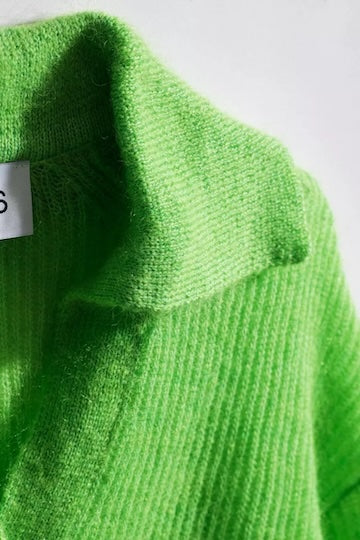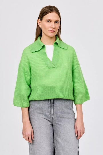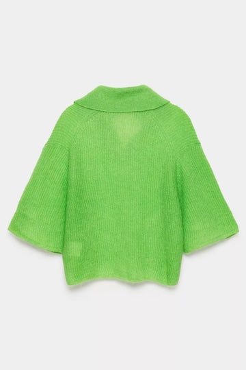 Spring-ready met deze groene, gebreide trui is een must-have. Dit item heeft halflange, wijde mouwen, een opvallende polo-kraag en een V-hals voor een relaxte look. Perfect voor frisse lentedagen, zowel casual als gekleed te dragen.