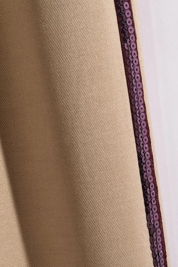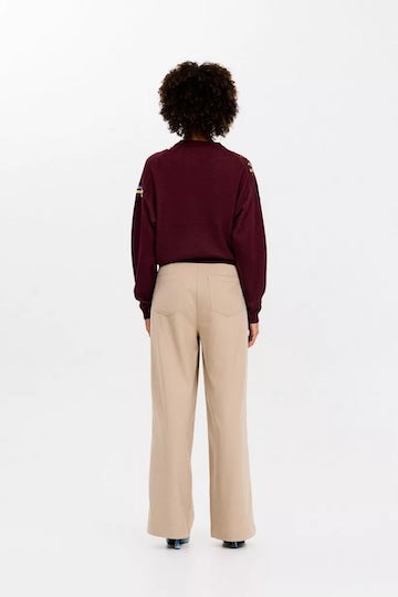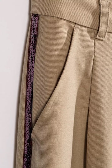 Deze damesbroek in zandkleur heeft een relaxte wide leg fit die comfort en stijl moeiteloos combineert. De bordeaux zijstreep met pailletten voegt een subtiele eyecatcher toe. Afgewerkt met zakken, riemlusjes en plooien aan de voorkant is deze broek ideaal voor zowel casual als dressed-up momenten.