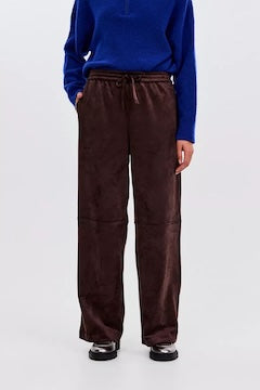Trend alert! Suede is deze winter hot and happening, en deze donkerbruine suedine broek is dus een absolute must voor je kleerkast. Dit broek heeft rechte broekspijpen en een elastische tailleband met trektouwtje voor een relaxed vibe. Matching jasje verkrijgbaar.