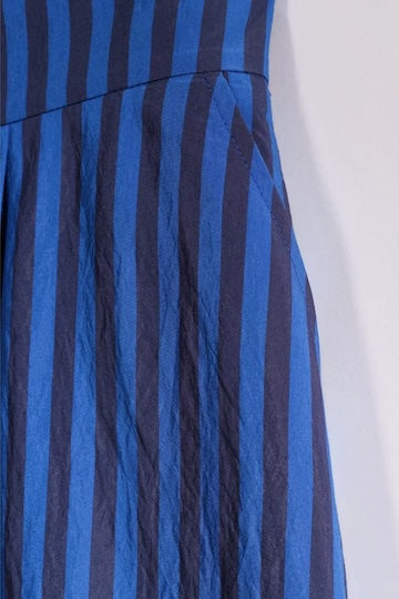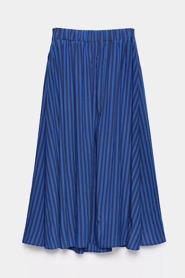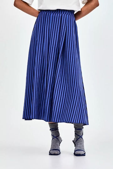 Fan van strepen? Met deze blauw gestreepte midi-rok haal je een stijlvolle essential in huis. Deze rok heeft een hoge taille, een A-lijn silhouet, plooien aan de voorzijde en een elastische tailleband. Vervolledig je look met de bijhorende blouse voor een perfect matching set.