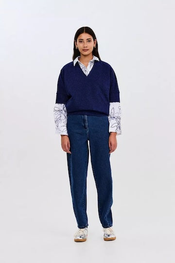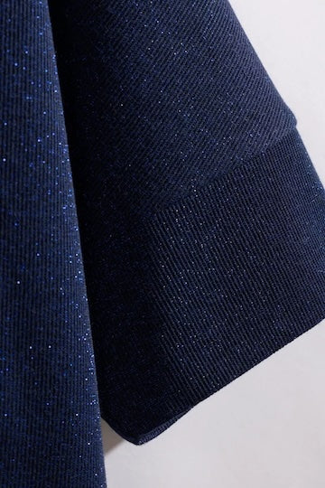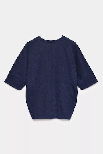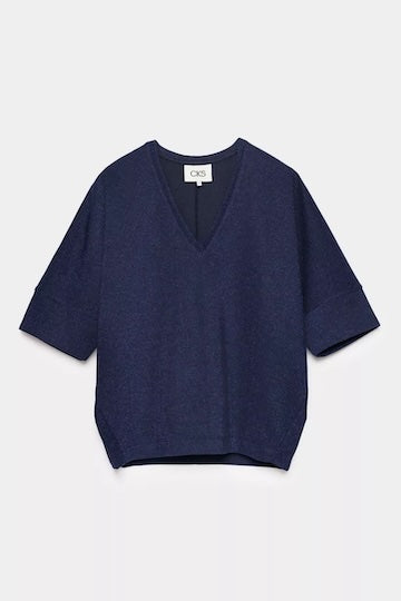 Donkerblauw T-shirt met korte mouwen met een V-hals en een relaxed fit. Dit casual T-shirt krijgt een feestelijke touch met glitters als detail. Je kan hem zowel met denim dragen, als met een geklede broek.
