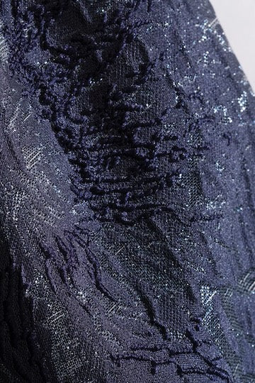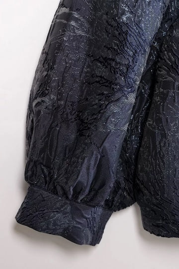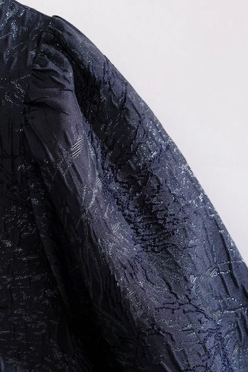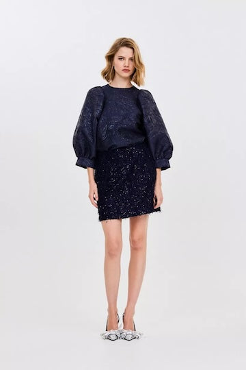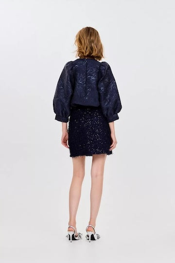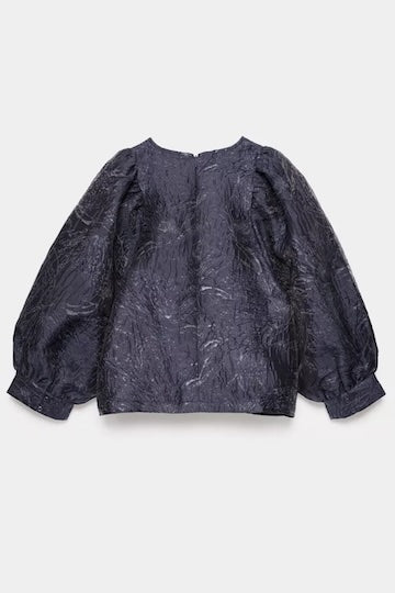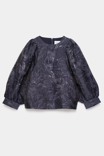 Feeling festive? Met deze donkerblauwe blouse uit onze feestcollectie ben je instant in de party mood. Deze top heeft halflange pofmouwen en is gemaakt uit een jacquardtextuur met glanzende details. Maak je party look compleet met een glitterbroek of rok.