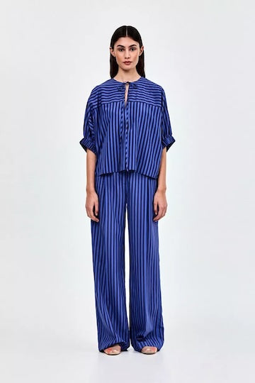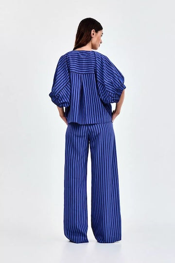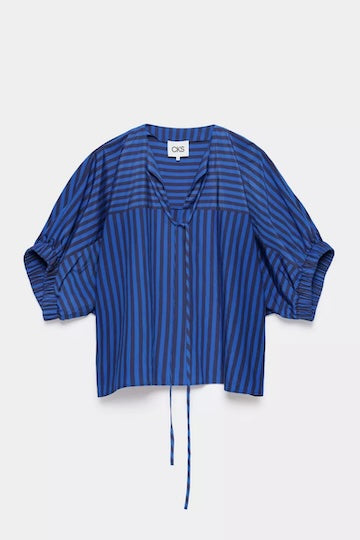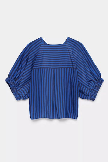 Deze blauw gestreepte damesblouse heeft halflange mouwen met elastiek die zorgen voor een zacht volume en een relaxte fit. Draag de blouse casual met denim of combineer met de bijhorende broek of rok voor een stijlvolle, effortless co-ord. Easy to love, easy to style!