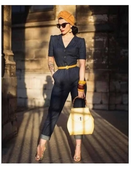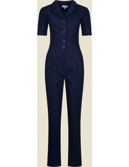 Draag het pak met pumps, sneakers of laarsjes en je zult zien hoe veelzijdig dit broekpak is! Het pak is gemaakt van een donkerblauwe denimstof van katoen, de stof heeft een klein beetje stretch.