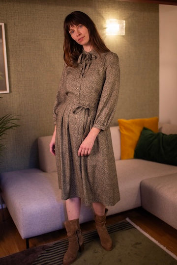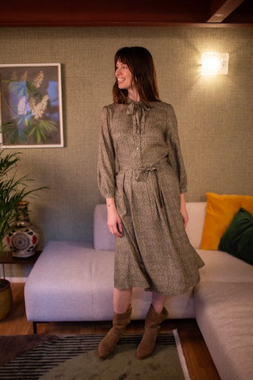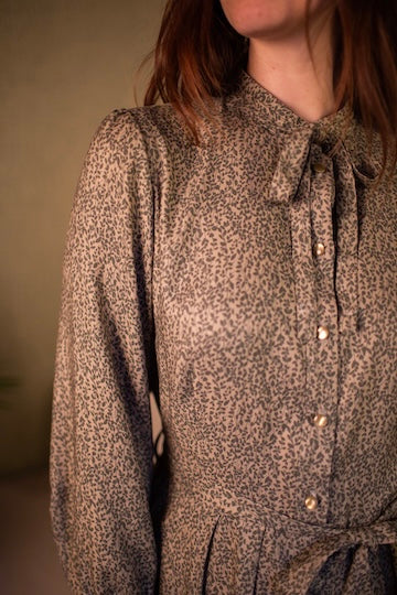 Deze Niko Dress is een elegante jurk met mouwtjes, een knoopsluiting voor en strikdetail in de hals. De taillenaad heeft elastiek aan de achterzijde en een bijpassend strikceintuur. De rok heeft een elegante midi lengte.